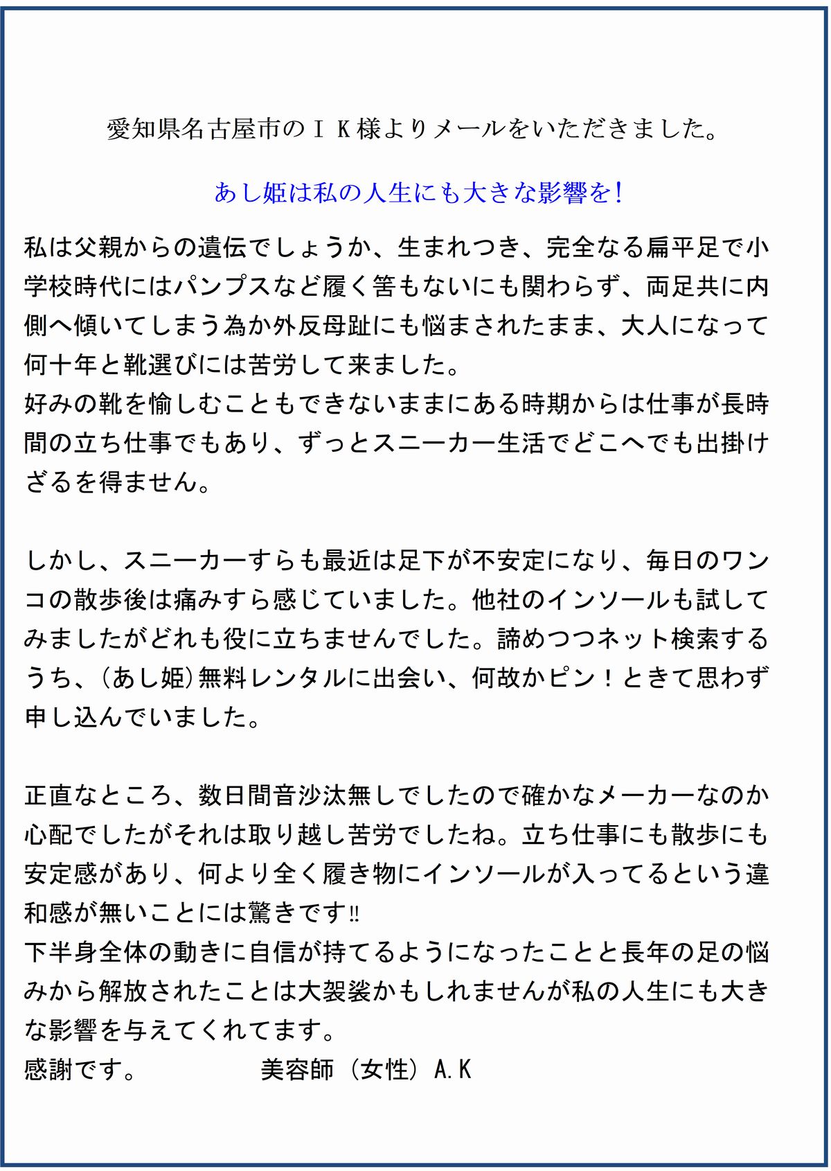 HOME > 「あし姫」を購入された、お客様のお喜びの声特集 編集が下手なので醜いページになりました。素人なものでお許しください。 もっと詳しい内容を知りたい方は→ ここをクリック もっと詳しい内容を知りたい方は→ ここをクリック もっと詳しい内容を知りたい方は→ ここをクリック もっと詳しい内容を知りたい方は→ ここをクリック 投稿日:2021年2月4日 author
